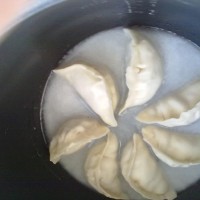 6、这时将调好的面糊水,倒入锅中。要记住水到饺子的“三分之二”就行了哦!!然后盖上盖子,按下煮饭键,再次跳到保温时,香香的锅贴饺就熟喽~~