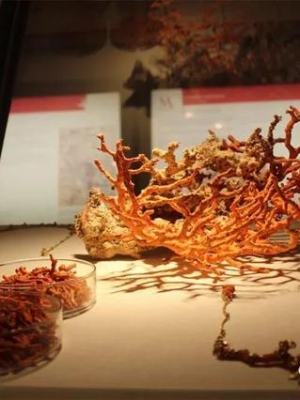 20世纪末,在江苏徐州东汉墓出土的兽形盒砚上,人们见到了最早的红珊瑚镶嵌物,它的颜色经过2000年之久依然生动。辽代北塔地宫出土的小型珊瑚法器和江苏无锡元代钱裕墓中出土的一件珊瑚桃形饰,都向人们诉说了红珊瑚所经历的早期辉煌。古人曾将红珊瑚与金、银、珍珠、玛瑙、琥珀、琉璃并列称为佛教七宝。我国清朝二品官员上朝穿戴的帽顶及朝珠系由贵重的红珊瑚制成。种种活灵活现的记述,无不凸显出红珊瑚在我国传统历史文化中的重要地位。