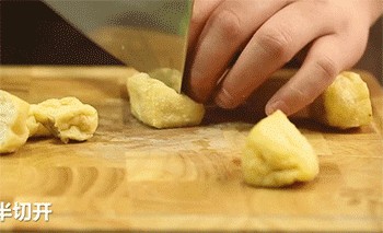 3、豆腐果对半切开。