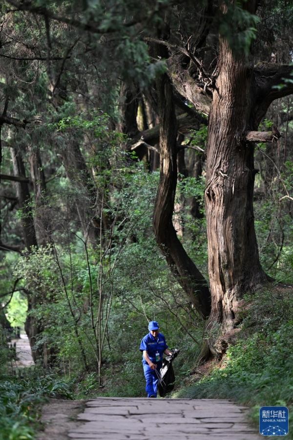 7月25日,一名清洁人员在翠云廊景区捡拾枯枝落叶。