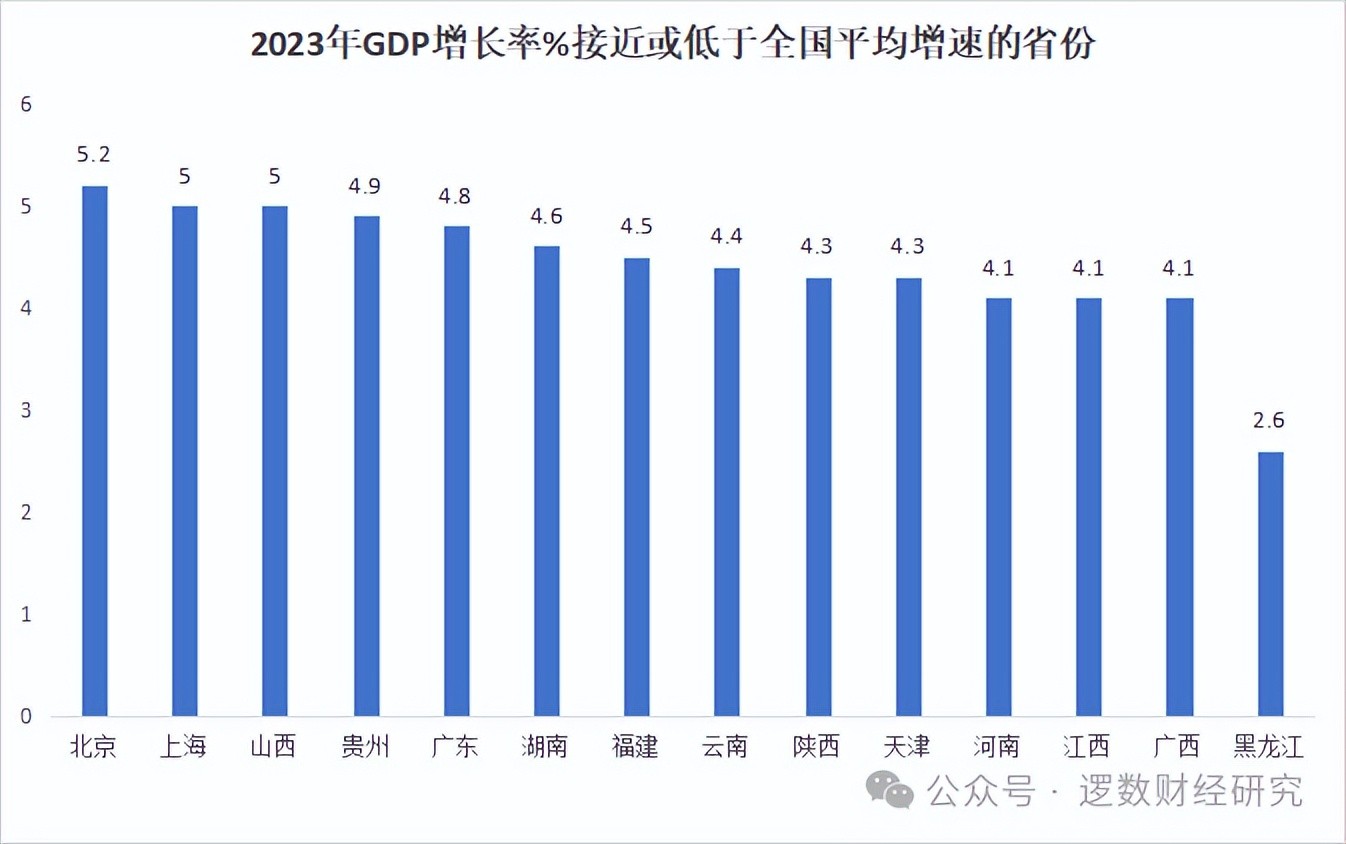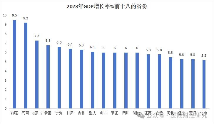 2023年有17个省份的GDP增速超过全国平均增速5.2%。其中西藏增速最高达到9.5%、海南达到9.2%排名第二,内蒙增长7.3%排名第三,新疆增长6.8%排名第四,宁夏排名第五增长6.6%。甘肃、吉林、重庆、山东、浙江、四川、湖北的GDP增速都在6%或以上的较高增速。总体来看,增长较快的地区基本都是西部地区GDP总量相对较低、增速较快。