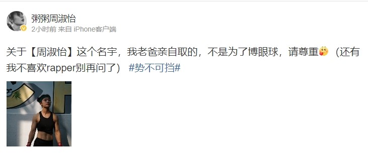 对于不少吃瓜的网友跑去评论,这位周淑怡也在评论区留言解释,表示:关于周淑怡这个名字,我老爸亲自取得,不是为了博眼球,请尊重!还有我不喜欢rapper,别再问了!