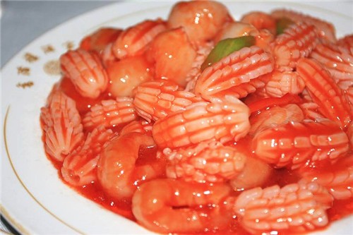 主、辅原料的形状不同、大小不一,如荔枝鱿鱼卷,主料鱿鱼呈简状蓑衣形,配料荔枝则为圆或半圆形。这类菜在形态上别具一种参差错落美。