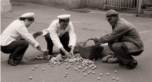 图为80年代的时候,两名警察帮助一名老大爷捡拾洒落的物品。