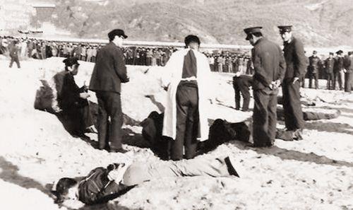 图为一批死刑犯被枪毙完成,法医正在刑场检查他们的尸体,确认是否已经死亡。
