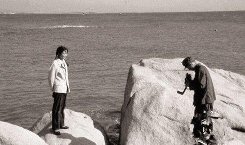 图为80年代的时候,一对小情侣在海边拍照留念。