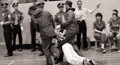 图为一名罪犯被判死刑立即执行,听到判决后,这名罪犯已经吓到腿软,警察把他拖走押入刑场。