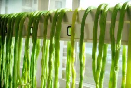 4、把豇豆对称挂在衣架上,每根豇豆之间留有空隙。5.两天就晒好了。