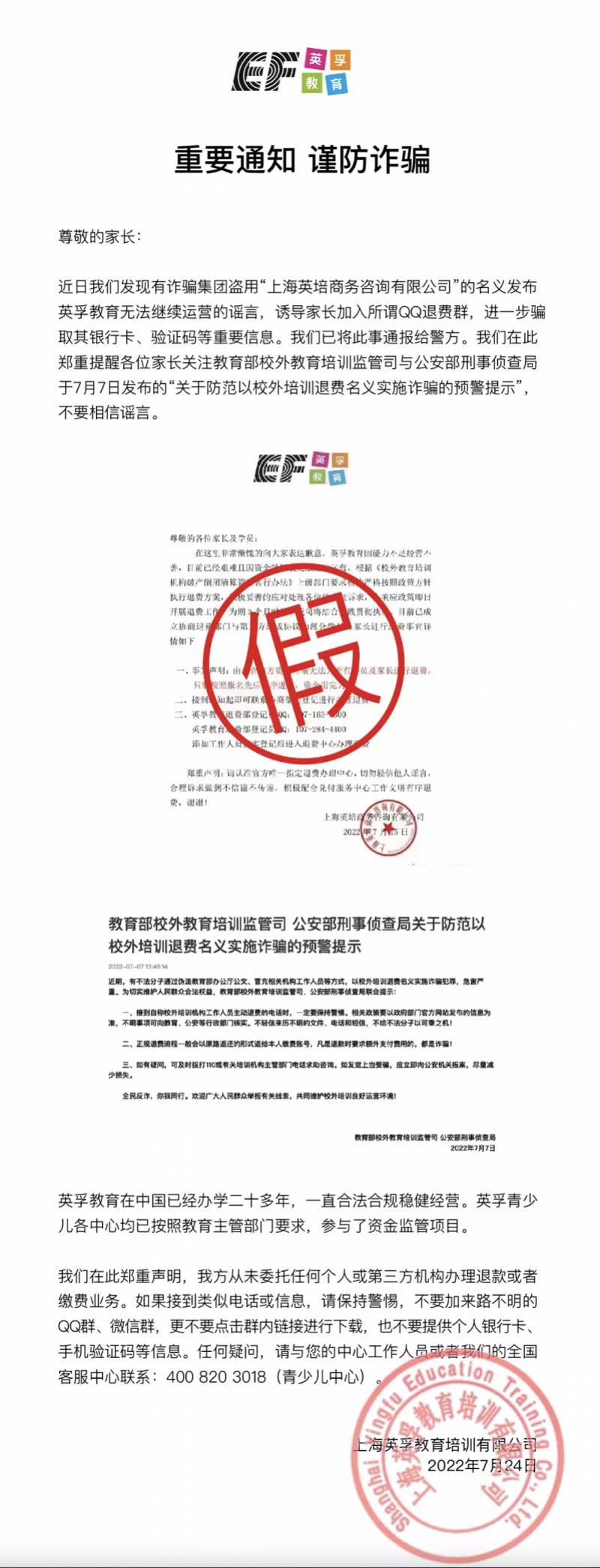 7月24日晚,英孚教育运营公司“上海英孚教育培训有限公司”于微博、微信公众号多平台发布回应,表示该传言系诈骗集团盗用公司名义发布,目的是诱导家长加入其所谓退费QQ群,以进一步骗取其银行卡、验证码等重要信息。英孚教育称,目前已报警,并提醒各位家长不要相信谣言。