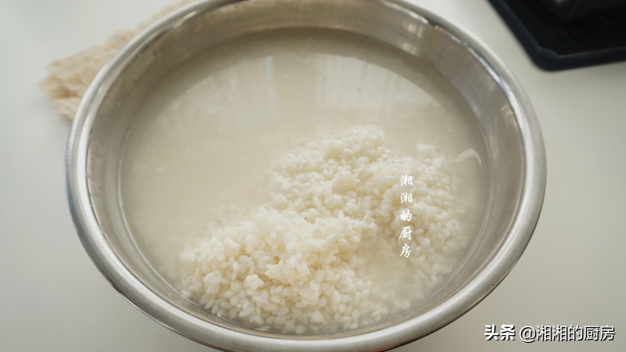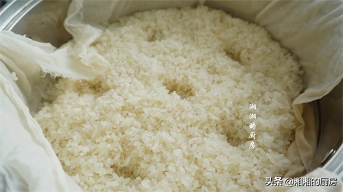 1、准备适量的糯米,我这里一共是一斤半的,加水浸泡一夜。经过浸泡的糯米,更容易蒸熟,而且不夹生。