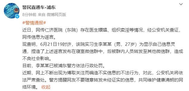 实习生李某某(男,27岁)捏造并散布此谣言,已被浦东警方依法行政处罚。警方也提醒网友不要随意转发未经证实的信息,共同维护健康清朗的网络环境。