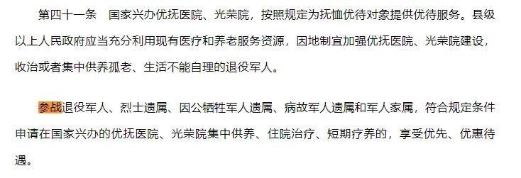接下来,第四十一条和四十四条聚焦于医疗优待,确保了参战退役军人在医疗服务上的优先权。这不仅包括在优抚医院和光荣院享受优先优待服务,还鼓励其他医疗机构为参战退役军人提供优惠,如减免部分医疗费用、优先安排就诊等。比如,一位参战老兵因旧伤复发需要治疗,他可以在指定的优抚医院快速得到专业诊疗,而在普通医院就诊时,也能凭借参战退役军人身份享受费用减免或优先就诊的便利。