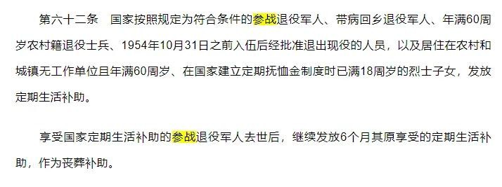 最后,第六十二条关于定期生活补助和丧葬补助的规定,为符合条件的参战退役军人提供了长期的经济支持。这不仅是对他们过去贡献的认可,也是对他们晚年生活的保障。当这些退役军人去世后,其家属还能获得丧葬补助,以减轻丧葬费用的负担。例如,一位参战老兵退休后,因身体原因需要长期治疗,定期生活补助将为他提供稳定的经济来源;一旦他去世,家属将获得丧葬补助,以表达对逝者的尊重和对家属的关怀。