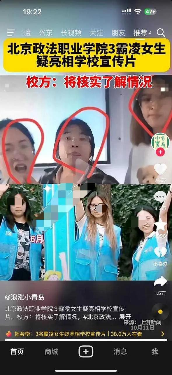 随着事件热度慢慢过去,该学校在今天招生季又发布了宣传视频,霸凌事件当事三个女生竟然出现在了其中。说明学业并未受影响,而之前得知的信息是制止霸凌的男生已然退学。简直粉刺,一个政法学院句能能做出这种事!于是网友对此进行了跟踪调侃。