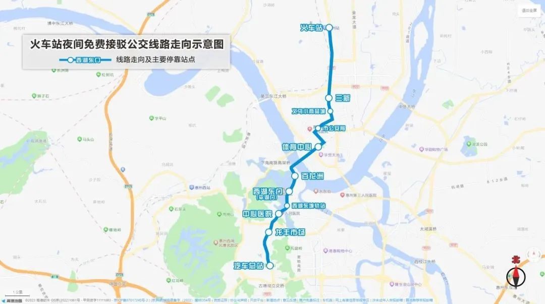 新增临时接驳线路,由惠州火车站始发,沿惠州大道、三新南路、文华一路、云山西路、惠州大桥、环城西路、鹅岭北路、鹅岭南路行驶至市汽车总站,沿途按公交站点停靠,全程免费乘坐。线路服务时间为22:30至次日4:30,共发4个班次。