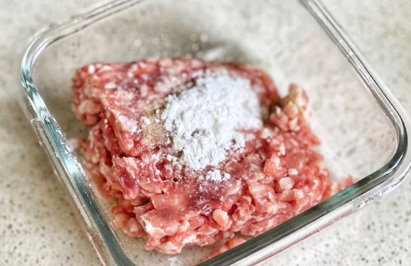 【第二步】肉末提前用少量盐、料酒、白胡椒粉和淀粉腌制15分钟。