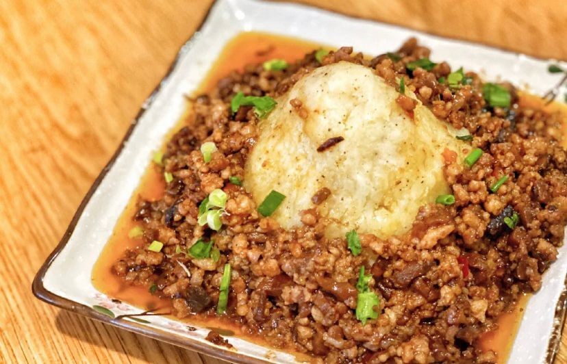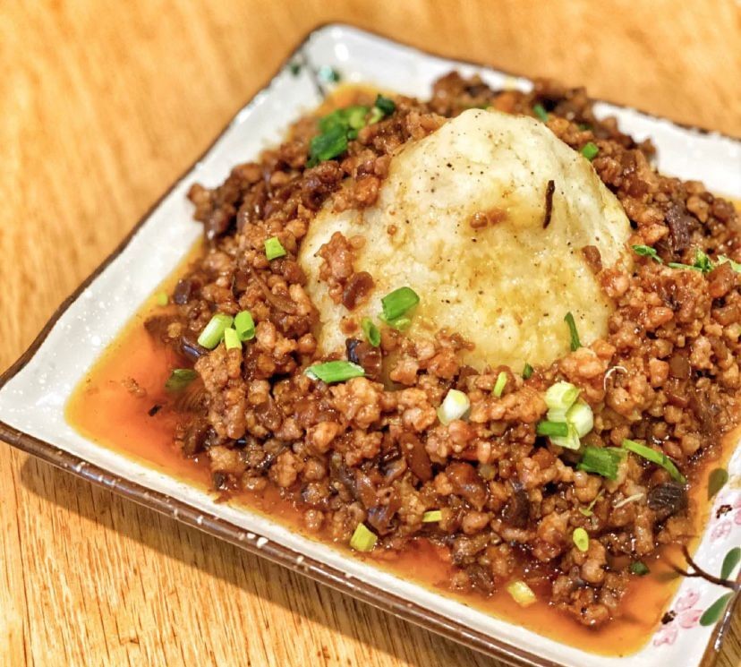 【第三步】热锅放少量油下肉末煸炒出香味至逼出猪肉本身的油分后,加入郫县豆瓣酱,生抽,蚝油和糖翻炒均匀,加入少量水煮一会儿, 喜欢爽滑口感的这一步还可以勾下芡哈,出锅把肉末浇在土豆泥上撒上葱花就可以开吃啦(我正好有香菇酱就加了一勺增加风味)