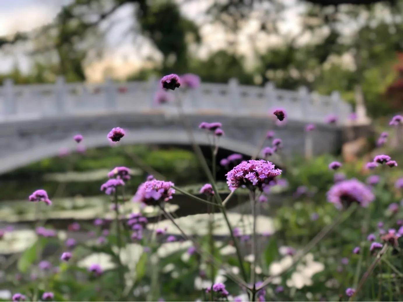 小桥流水交相辉映,艳丽的花朵点缀其间。