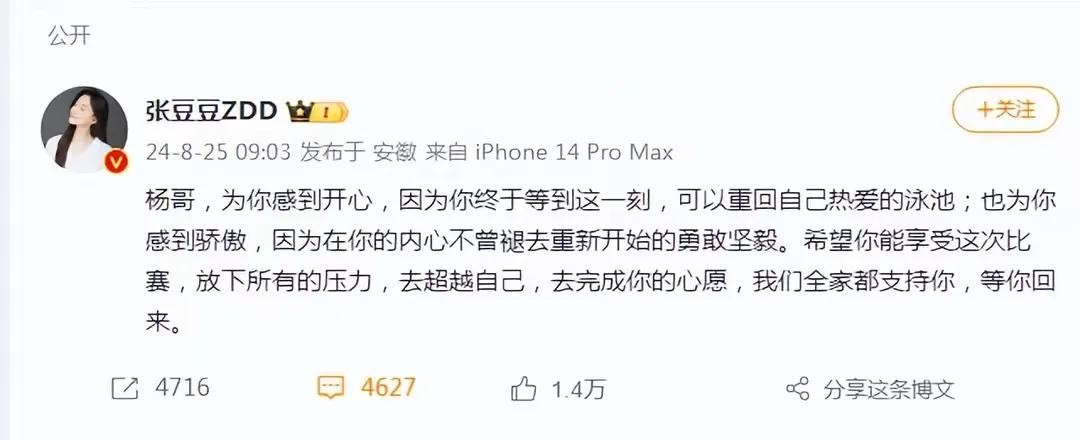 孙杨妻子张豆豆深情发文:杨哥,为你感到开心,也为你感到骄傲。