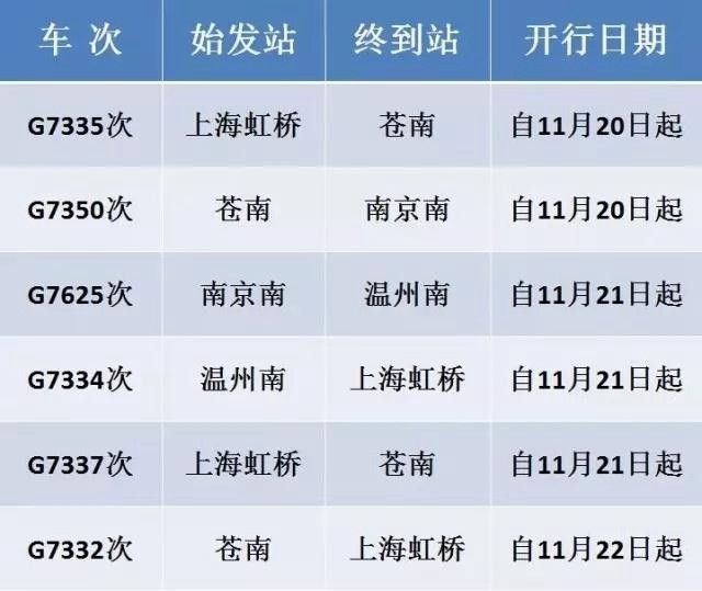 11月20日起,“复兴号”动车组列车扩大开行范围,新增沪昆高速、宁杭高速、金温线、杭深线4条线路共6列班次,涉及28个车站。据了解,这次新开的6列“复兴号”为CR400BF型动车组,列车开行沿途涉及沪昆高速、宁杭高速、金温线、杭深线4条线路28个车站,分别为:苍南、鳌江、瑞安、温州南、青田、丽水、缙云西、永康南、武义北、金华南、义乌、诸暨、杭州东、余杭、海宁西、桐乡、嘉兴南、嘉善南、松江南、德清、湖州、长兴、溧阳、南京南、常州、无锡、苏州、上海虹桥。