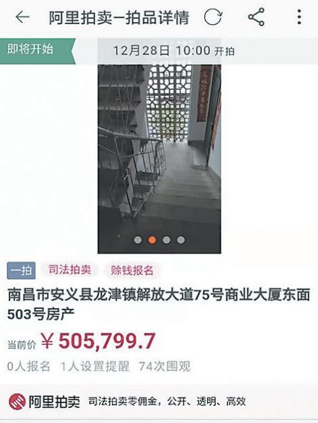 根据刘先生提供的信息,记者在安义县人民法院阿里巴巴司法拍卖网络平台上看到,一套地址为“安义县龙津镇解放大道75号商业大厦东面503号”的房产将被网拍,建筑面积107.89平方米,起拍价为505799.7元,拍卖活动将于12月28日上午10时开始。