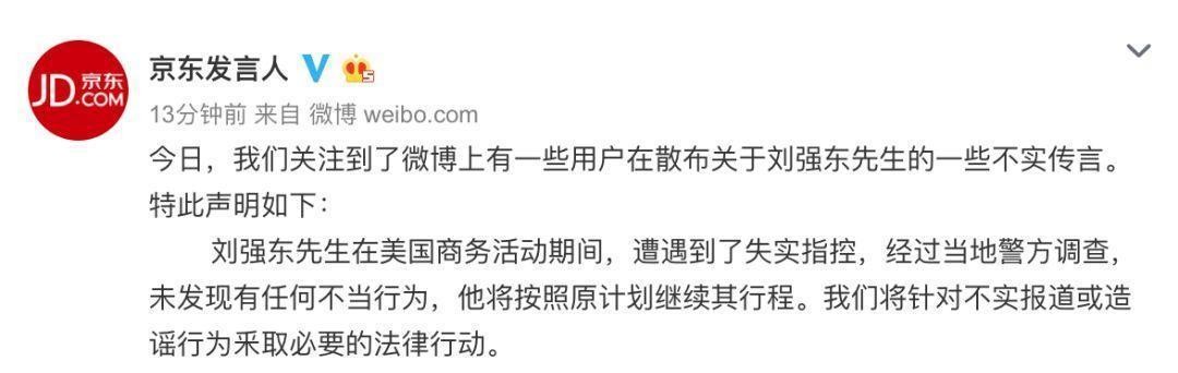 “刘强东先生在美国经商活动中遭遇不实指控,经当地警方调查,未发现犯罪行为,他将按原计划继续行程。”对不实报道或谣言采取必要的法律行动。行动。”