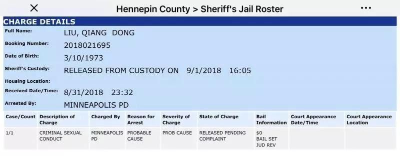 据亨内平县治安官办公室监狱名单显示,京东创始人刘强东周五晚上被明尼阿波利斯警方拘留,周六下午被释放。
