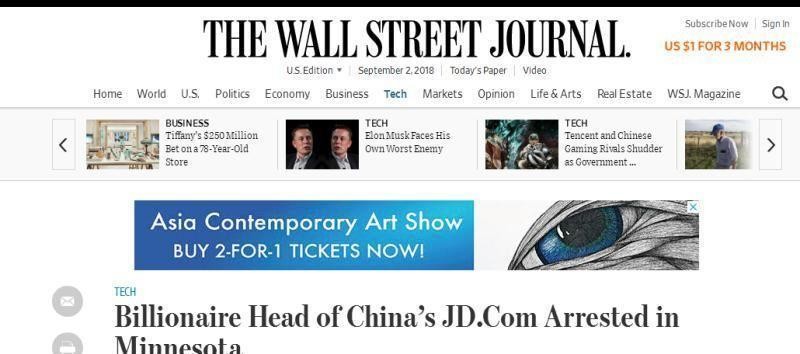 《华尔街日报》还宣布京东创始人刘强东在美国被捕。