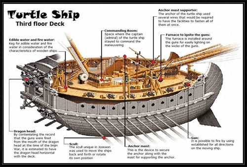 只能说这种战船在海上发动冲锋的时候有一定的优势,但是不是如电影或者韩国人说的那样为一种海战神器,一艘顶几十艘的战力。这种战船也因为造价昂贵,实际上在整个万历朝鲜战争中数量非常少,李舜臣总共只建造了3-5艘龟船,凭着3-5艘这样的战船对战数百艘敌船,也不至于能够起到扭转战局的作用。