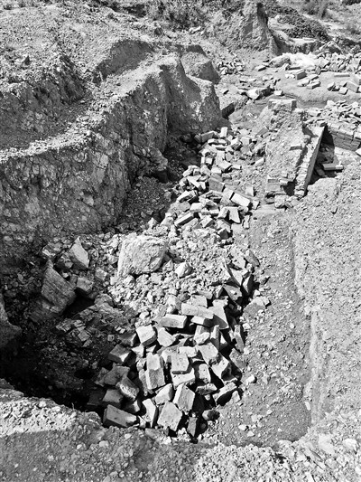 因为无人监管,不少人在捡砖的过程中也破坏不少墓葬内的砖块。张国雄提供的照片显示,考古队撤走前,墓葬内的砖块都是完整地砌在一起,其中的排水系统也清晰可见。现在不少墓葬坑已经坍塌,砖块也被破坏。