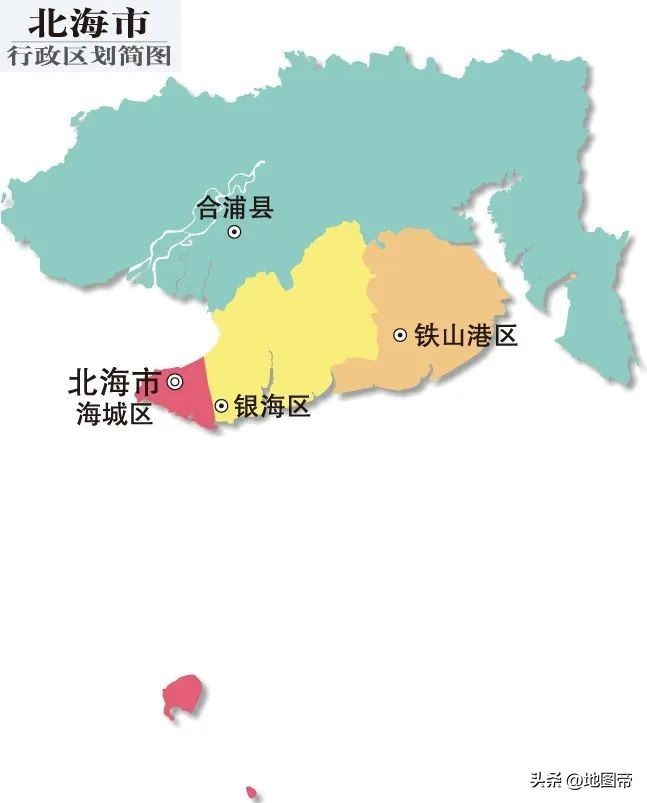 1950年,设置地级北海市,属广东省。1952年,北海市及合浦县划归广西省。1955年,北海市划归广东省。1965年,北海市、合浦县划归广西壮族自治区。1987年,合浦县划归北海市。