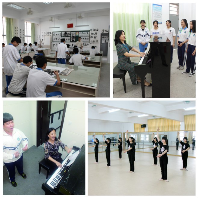 音乐特长生培养:采取专业班的教学与管理模式,进行小班化教学,注重“因材施教”,循序渐进,传统课堂与小组课、集体课有效衔接。注重音乐审美体验、音乐技法训练,通过对各种歌曲、乐曲的歌唱、欣赏和情感体验,借助于音响、音调、音色和节奏、旋律,提高学生听觉上的艺术趣味、审美能力,突出协作、探究精神。高一利用课余及晚修部分时间进行集中辅导,教授乐理视唱练耳声乐钢琴课程。高二年级进行专业课学习。举办“合唱节”“文艺汇演”等,提供艺术实践和特长展示的平台,检验学生音乐技能,让特长生获得成功的体验。