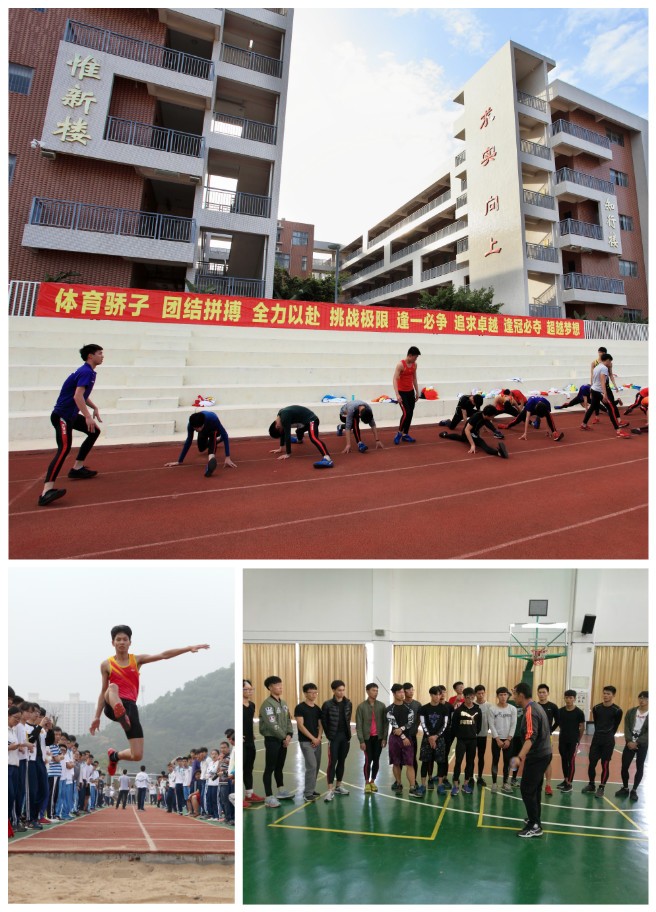 体育成绩:2018年高考术科本科与重本上线率高达84%与36%,华南师范大学、深圳大学等本科院校双过过线43人。2019年高考术科本科与重本上线率高达86%与37%,华南师范大学、深圳大学等本科院校双过线44人;2020年广东省术科联考本科与重本上线率高达86%与40%,其中黄佳豪同学以四科(100米、原地推铅球、立定三级跳远、排球专项)每科75分总分300分满分的好成绩荣获广东省体育术科联考第一名!