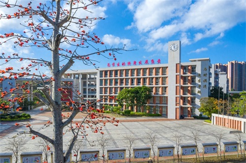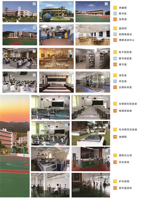 学校办学条件一流,教学设施齐全,整体布局规范,校园环境优美,人文气息浓郁,建筑颇具现代风格。有现代化的教学楼、功能先进的多媒体语音室、多媒体综合电教室、电脑室、多功能电子阅览室、成套装配的理化生实验室、理化探究实验室、地理专用课室、综合实践活动室。地理园、生物园、图书馆、阅览室、美术室、音乐室、篮球场、足球场、排球场、羽毛球场、体育馆等功能场室一应俱全。拥有全市一流的校园电视台。所有课室与宿舍都配有空调,温馨而舒适。