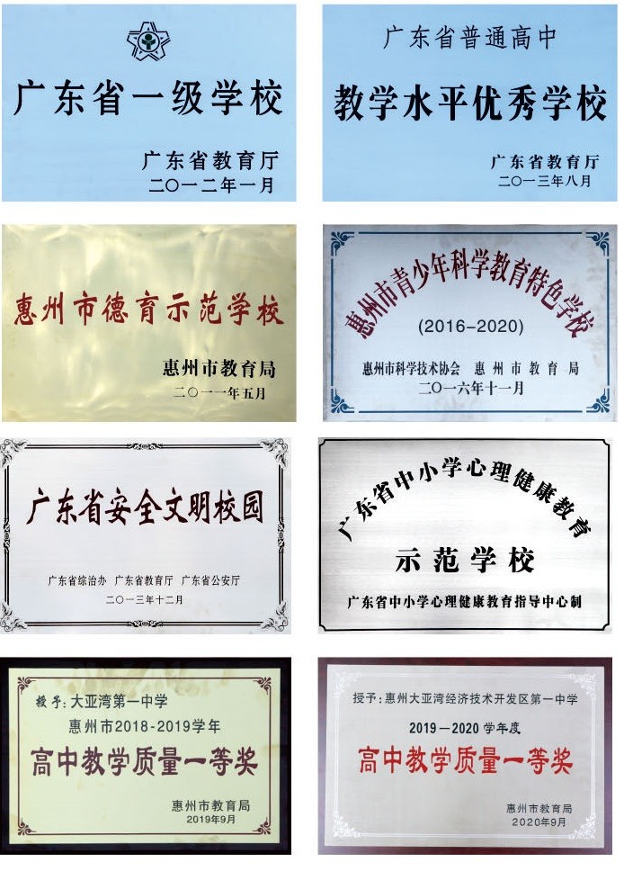 2015年至今,高考本科、重点本科升学率大幅提升。2020年高考,高优上线162人,高优达成率23.2%。本科上线562人,本科达成率80.6%,本科与重点本科上线率均稳居惠州市前列。2020教学质量“惠州市2020年高中学校培养能力评价结果”显示,大亚湾第一中学排名居惠州市第二,充分体现学校加工能力,彰显“低进优出”品牌。连续五年荣获“惠州市高中教学成果奖一等奖”、“惠州市教育科研成果奖一等奖”等荣誉称号,每年都被大亚湾区管委会授予高中教学成果优秀奖,大亚湾区教书育人先进单位。尖子生打造亮点突出。2015年,韦宁宁同学以674分列惠州市理科第7名并被香港大学理学院录取,陈博涵同学被香港中文大学录取。2016年,14岁的高二学生黎子翀以663分的总分位列惠州市理科总分前10,是中国科技大学少年班学院在广东录取的唯一学生。2020年,陈英华、王峥洋被清华大学录取。张灏生、卢兆唯、钟雯利、黄润泽等数百名学生被中山大学、同济大学、中南财经政法大学、华南理工大学、暨南大学、华南师范大学、中南大学、武汉大学等全国一流重点大学录取。近五年来,我校学生在各学科竞赛中获得省级以上(含省级)一、二、三等奖的有1223人次。在2016年全国高中应用物理知识竞赛中,黎子翀同学获全国一等奖(惠州市第一名);在“第十八届全国青少年五好小公民‘少年向上、真善美伴我行’主题教育活动演讲比赛及征文比赛”活动中,黄泽良、黄珊珊同学分别获得征文比赛中学组特等奖和一等奖;在惠州市合唱比赛中多次获市一、二等奖;在惠州市第五届运动会中获2金、3银、4铜前6名15项的佳绩。学校合唱团、舞蹈队、田径队、篮球队、足球队、健美操队多次获得市、区比赛大奖。