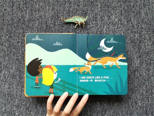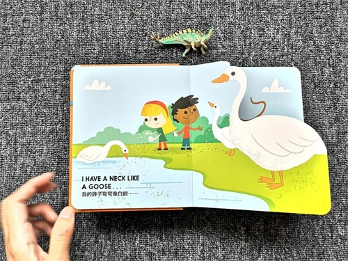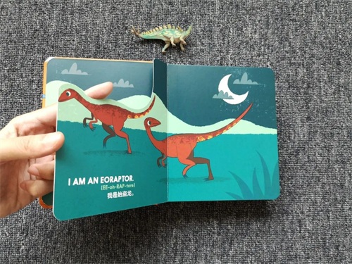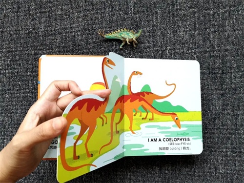 这样的设计剪裁既有惊喜,相关事物的关联对于孩子的想象力也是非常好的锻炼,低幼的认知书很多都做成了双语书,这本也不例外,针对英文恐龙名字比较难的特性,也配套了相应的音频。而且画面颜色看起来很舒适,边角很圆润,质感很好。