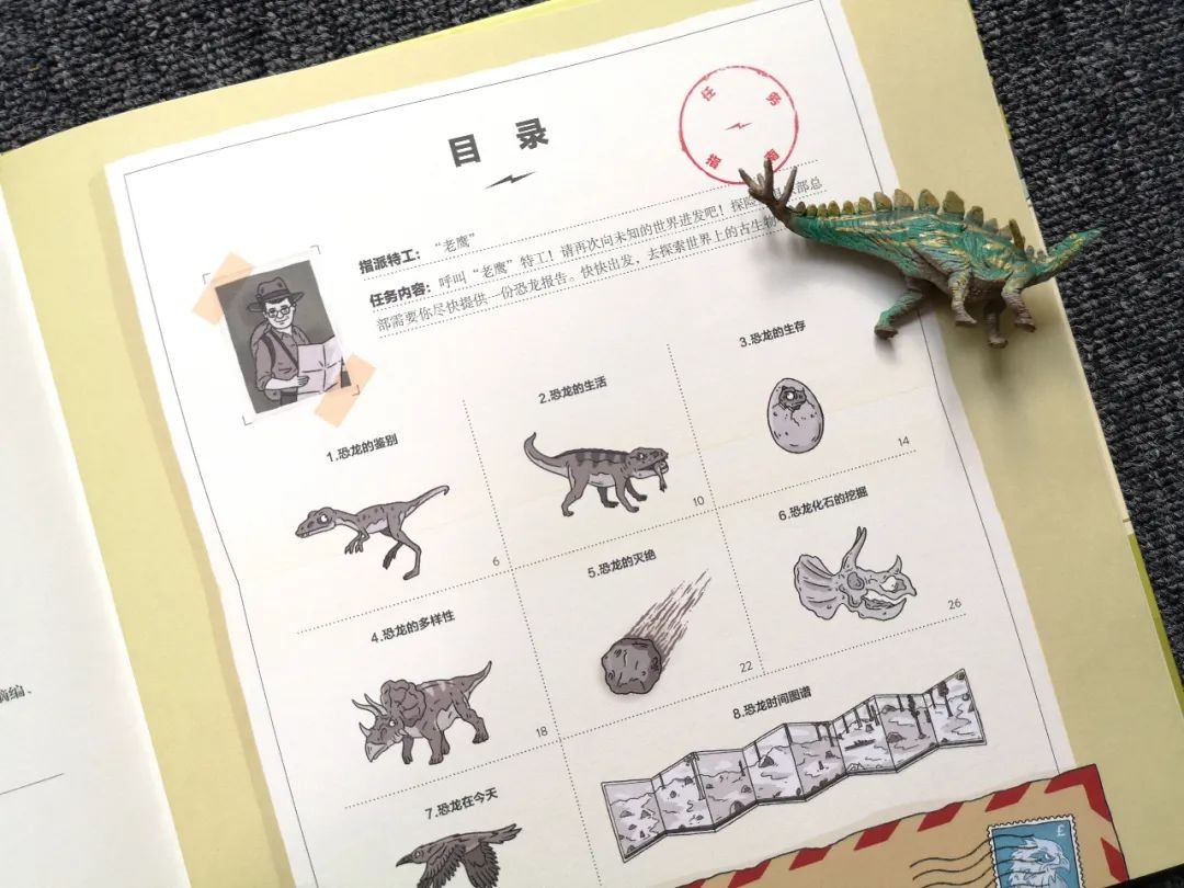 科普内容是比较严肃的,怎样用孩子看得进去的方式呈现,这也是童书作家和编辑需要考虑的事情。这本书表达的形式新颖又有趣,搭建了一个探险场景,让孩子跟着特工“老鹰”一起去探索恐龙的秘密。