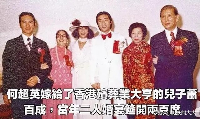 随后,何超英嫁给了香港殡葬行业大亨的儿子萧百成,当年二人婚宴高朋满座,开席两百余桌,业内有头有脸的大人物全都悉数到场祝贺。