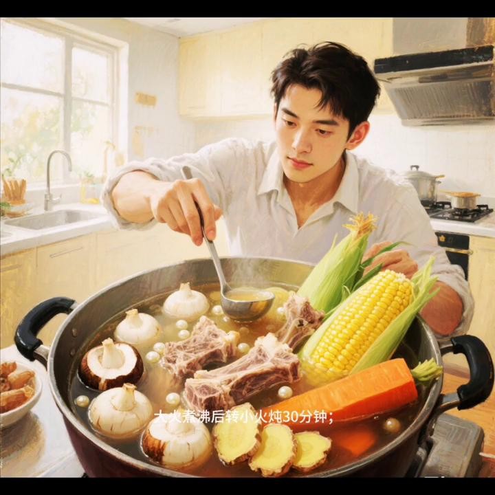 →3.加入玉米、胡萝卜和马蹄,继续炖20分钟至食材软烂。