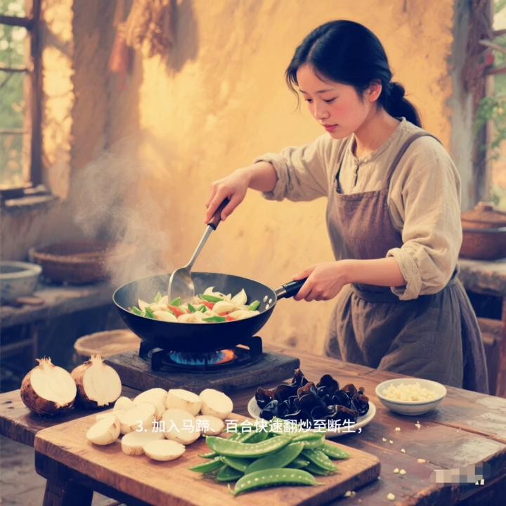 →3.加入马蹄、百合快速翻炒至断生,加少量盐调味即可。