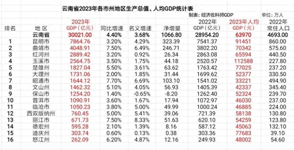 云南省16个市州2023年地区生产总值已全部公布,玉溪人均GDP最高