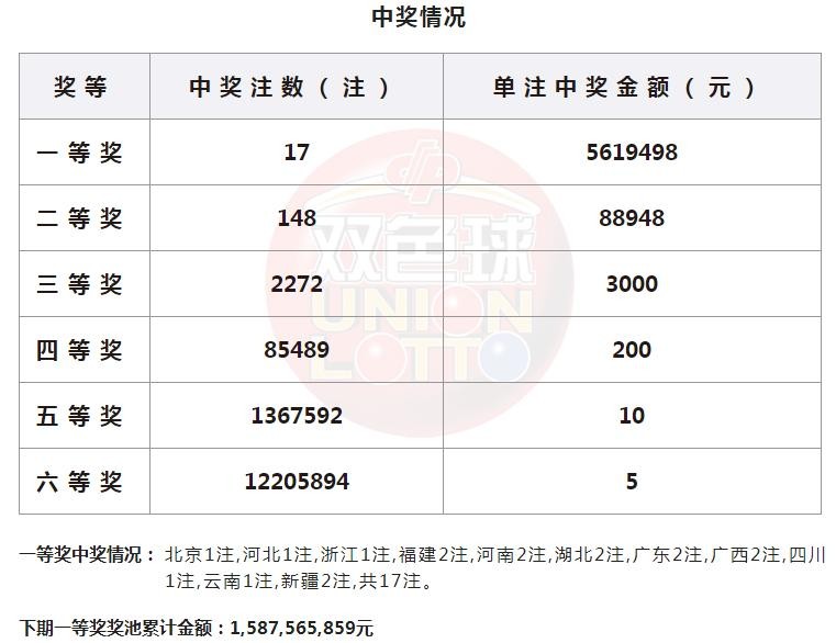 本期一等奖开出17注,单注奖金561.94万元,被北京、河北、浙江、福建(2注)、河南(2注)、湖北(2注)、广东(2注)、广西(2注)、四川、云南和新疆(2注)的彩民分享。本期二等奖开出148注,单注奖金8.89万元,本期销售额3.08亿元,目前奖池资金累计金额为15.87亿元。