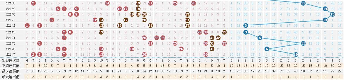 本期红球三区比为3:2:1,一区号码热出。012路方面,本期0路号码给出2枚,1路号码给出2枚,2路号码给出2枚。本期红球和值开出75点,与上期相比下降26点。其他方面,红球奇偶比为3:3,大小比为2:4。