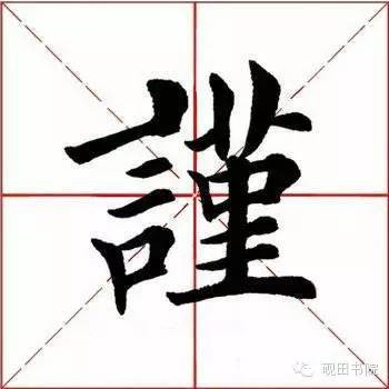 左部“言”旁为固定写法,斜势抗肩,左伸右缩。首笔竖点靠右,用笔厚重;第二笔横画起笔左探,大抗肩,右边接竖点;下面两小横右齐左不齐;下面“口”不要写大,整体抗肩, 位置偏左,左竖稍长。注意上面诸横基本等距平行。