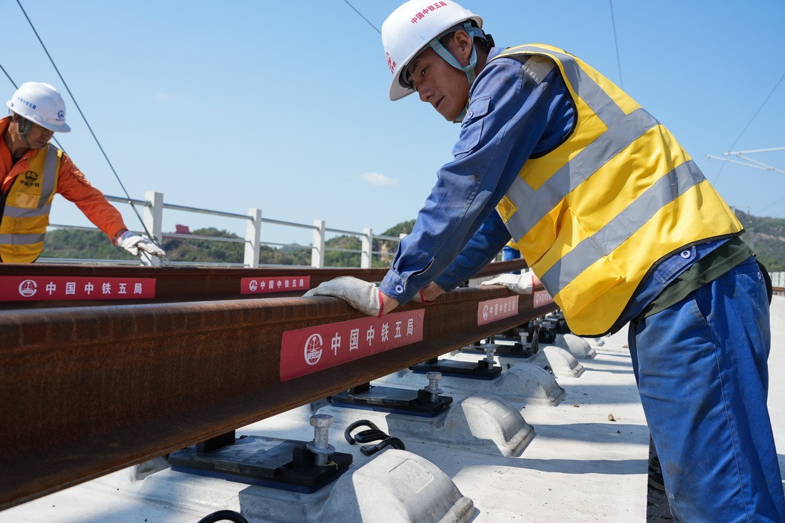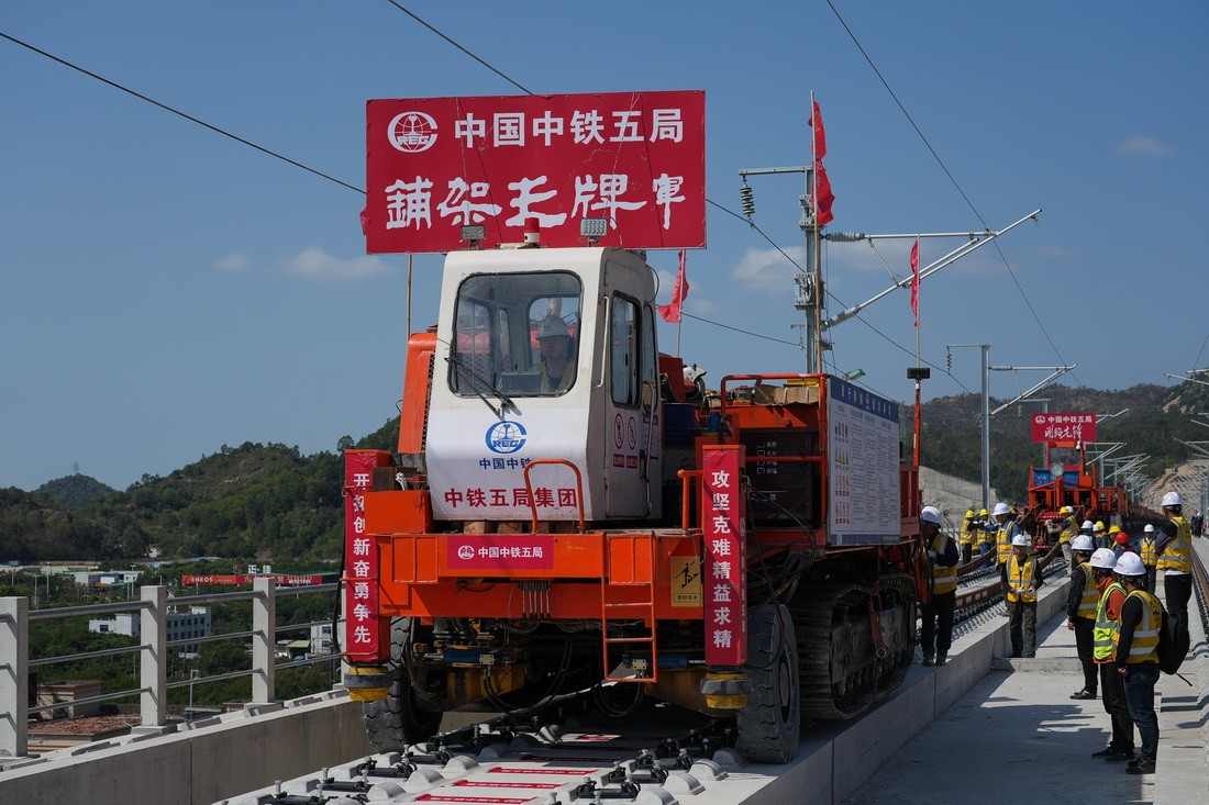 2月23日,中铁五局承建的广汕铁路正线最后一组500米长轨在汕尾东冲特大桥铺设完成,该线正线铺轨实现贯通。广汕铁路是“轨道上的大湾区”高铁骨干网重要组成部分,该线全长202公里,时速350公里,途经广州、惠州、深汕特别合作区、汕尾。全线通车后,广州到汕尾运行时间将缩短至1小时以内。新华社记者 刘大伟 摄 2月23日,中铁五局轨道铺架车在汕尾东冲特大桥铺设广汕铁路正线最后一组500米长轨(无人机照片)。
