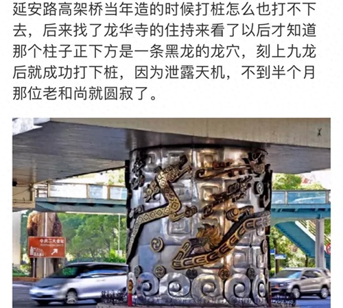 上海人评论确有此事,只是没有所谓的打生桩或活人桩。只是当年建设南北高架各处工地都开展很顺利,唯独这和位置桩打不下去,打下去就会断桩。最后请来了某个知名寺庙的大和尚主持(不太方便讲,讲了人家也不会承认的)。开始人家不肯,因为知道会泄露天机,但是“BOSS”出面干预了,他才出手的。雕刻龙图腾来镇压底下某物就是天机,后来大和尚没过多久就圆寂了。至今没有任何官方承认或解释什么,但是这个龙柱确实存在(而且存在的很不自然,全上海那么多高架桥梁就这一处是特例)。老上海人基本都知道这事,现在还有不少游客会停在那个交通十字路口拍照留念