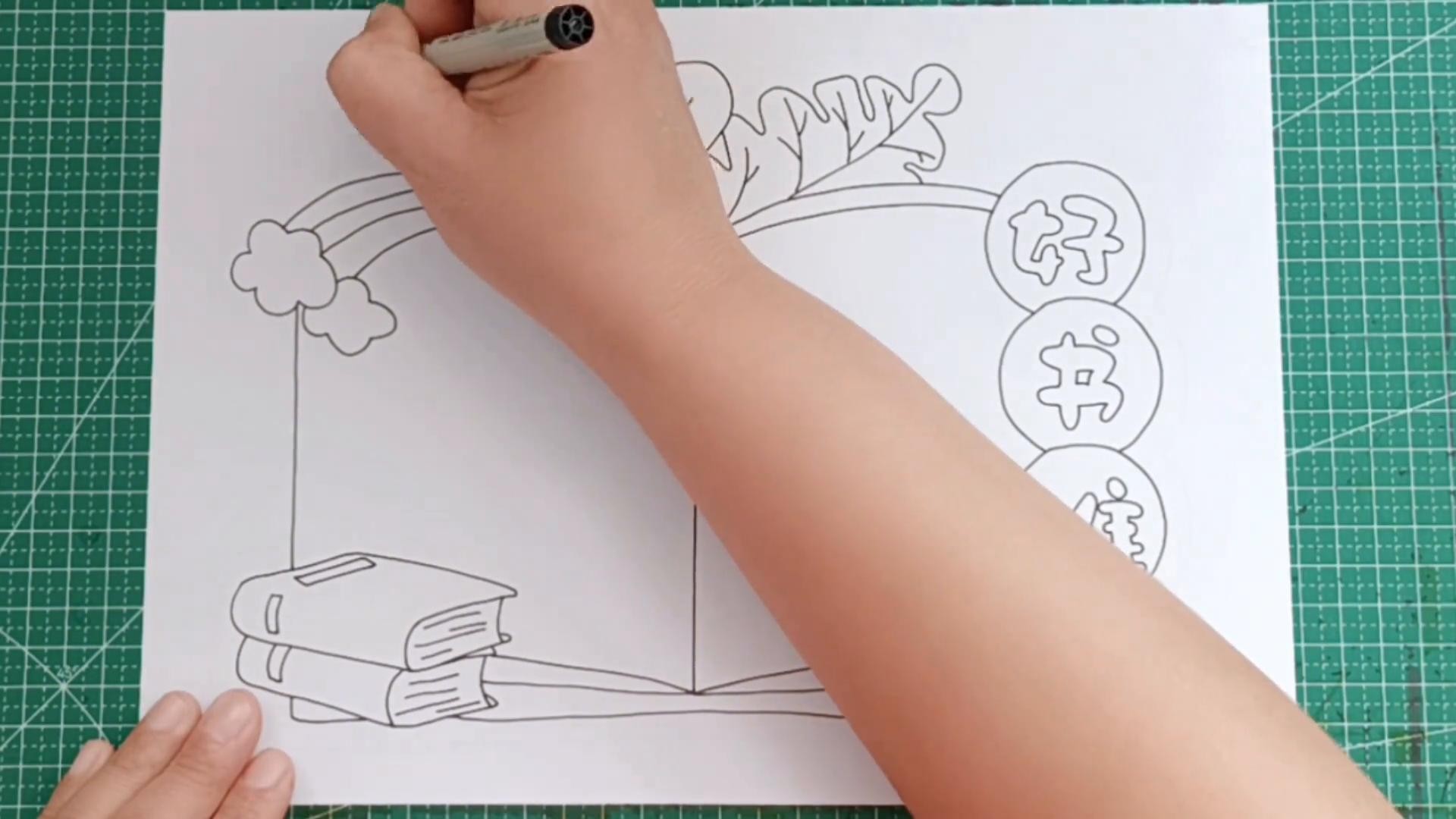 2. 然后用书本的外形将这些简笔画元素都连接起来。