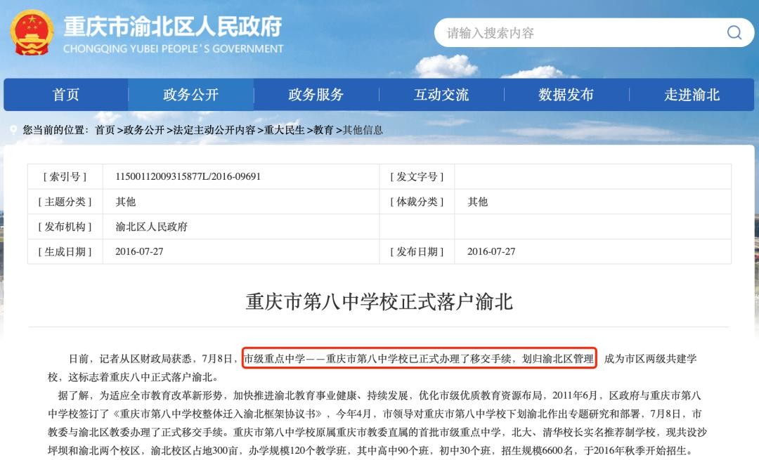 2016年,重庆八中就已经正式办理了移交手续,划归渝北区管理,属于市区两级共建学校。