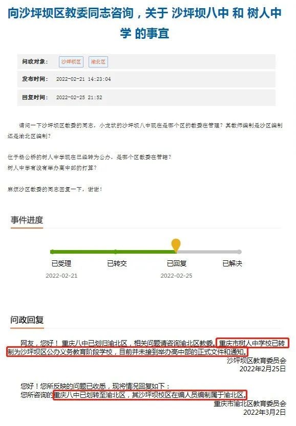 近期,有网友询问沙坪坝八中和树人中学归属问题,沙坪坝区、渝北区教育委员会进行了公开回复,一起来看看。