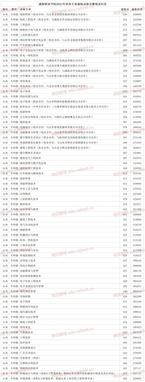 威海职业学院2021年省内专业最低录取分数线及位次